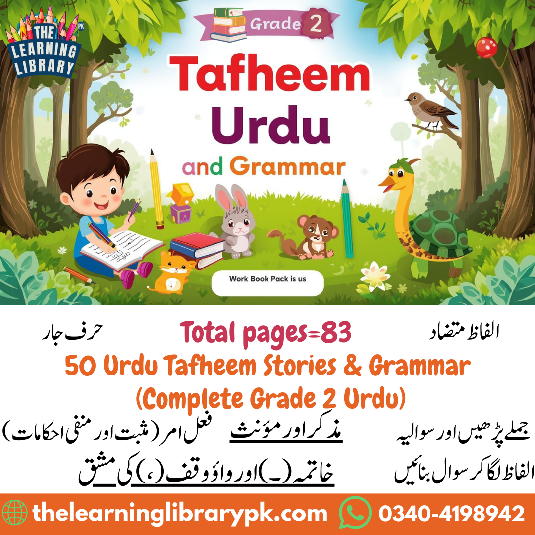 Build essential Urdu skills for Grade 2 with this complete pack! Designed for Second Class Urdu, it strengthens Tafheem-e-Urdu and Qawaid through 50+ ethical stories and skill-building worksheets on Jumla BandiImla, and Takhleeqi Tehreer. The perfect Urdu practice book for academic success.